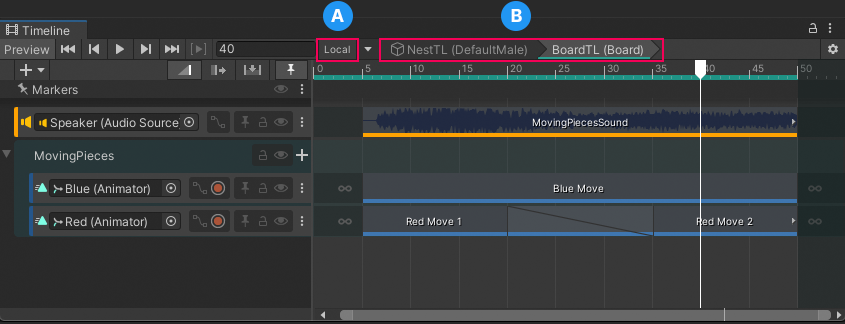 When you are editing a Sub-Timeline instance, the Timeline title displays a breadcrumb list of Timeline and Sub-Timeline instances. The Local or Global button indicates whether the Timeline ruler displays local time or global time.