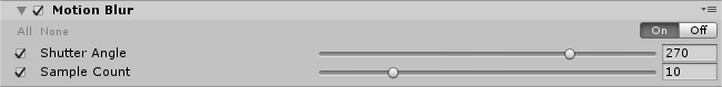 The Motion Blur effect blurs the image in the direction of the Camera’s movement. This simulates the blur effect a real-world camera creates when it moves with the lens aperture open, or when it captures an object moving faster than the camera’s exposure time.