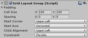 Unlike other layout groups, the Grid Layout Group ignores the minimum, preferred, and flexible size properties of its contained layout elements and instead assigns a fixed size to all of them which is defined with the Cell Size property of the Grid Layout Group itself.